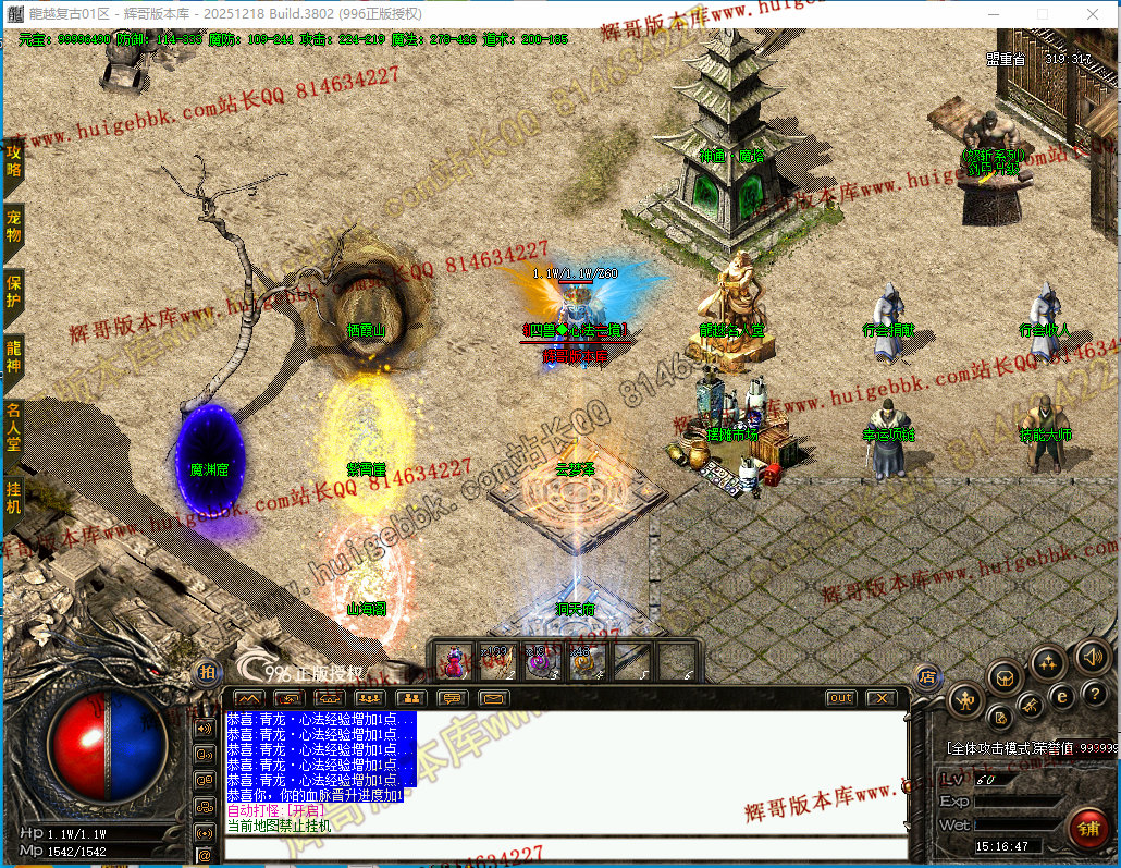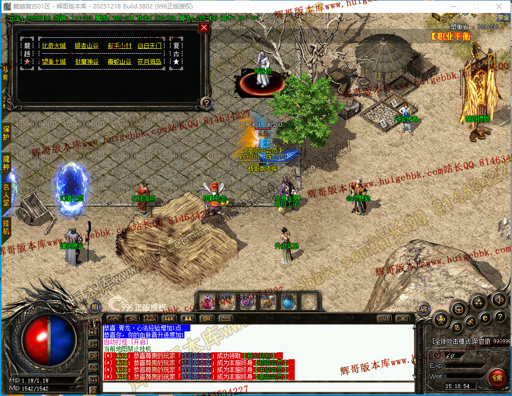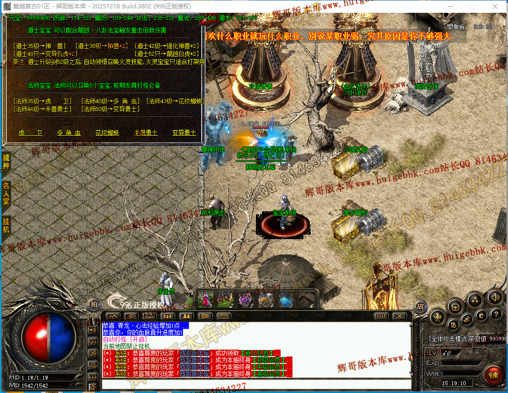 起步推荐职业:道士 (每个等级可召唤道士宝宝.52级可招龍越火灵宝宝.PK.单挑BOSS无压力)