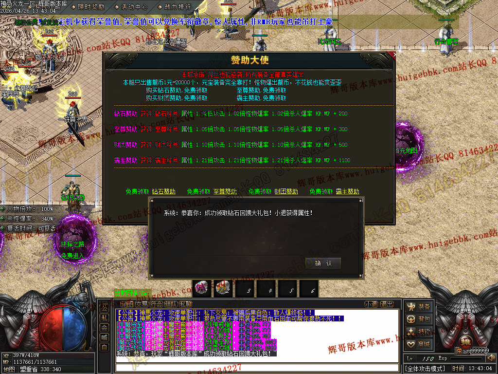 【土豪玩法】:赞助,称号送专属封号,倍功,爆率,属性,物品等大量宝物,绝对物超所值!土豪玩家2项必备!