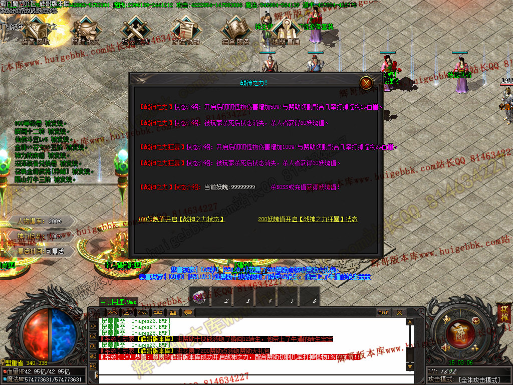 战神之力有100就开战神之力,200开战神之力狂暴,配合首充几率触发秒怪2%的血量,前期打怪很需要这个;