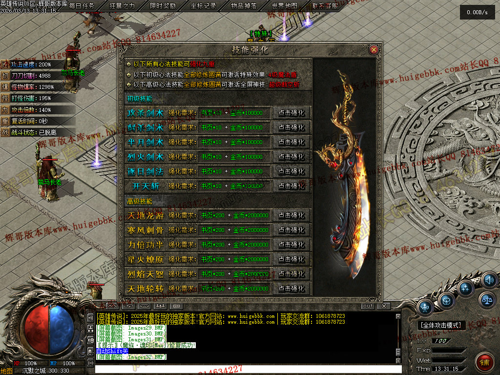 狂暴之力:刀刀切割+3888、打怪爆率+30%、半月弯刀十步一杀