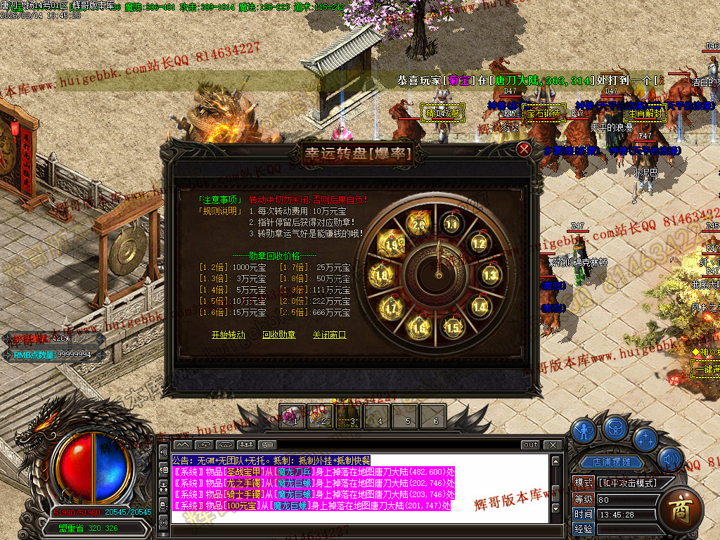 <7.打到元宝,在土城[爆率转盘]NPC碰碰运气(新手第一次免费获得1.1倍勋章)/SCOLOR=103>