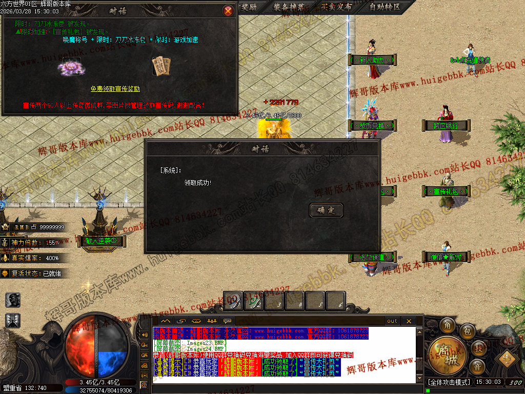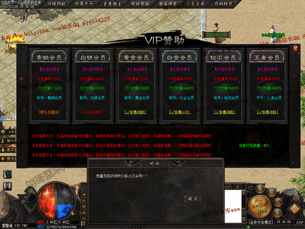 3.【神豪赞助】 充值数300 或 300修炼手镯 领取 爆率+300  全属性+3333  全元素+ 6%   几率切割怪物 3%生命 全屏吸怪附带绿毒范围15*15