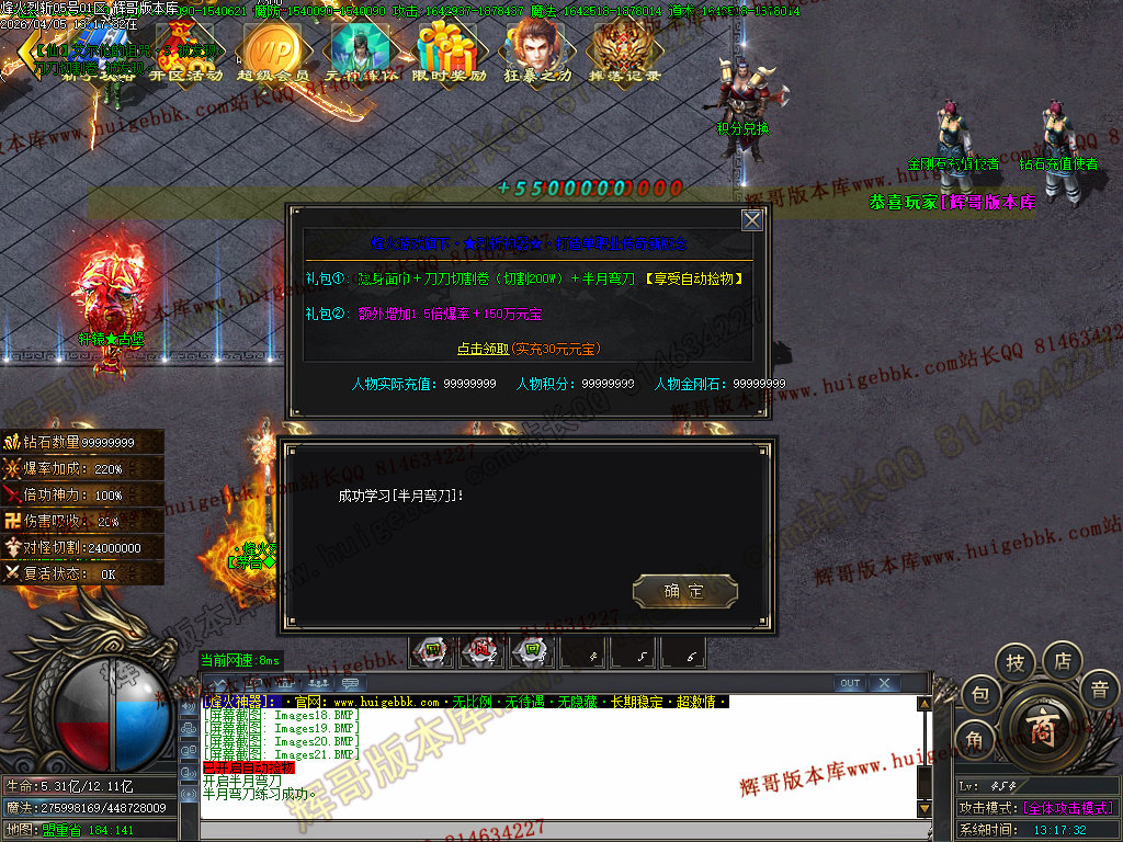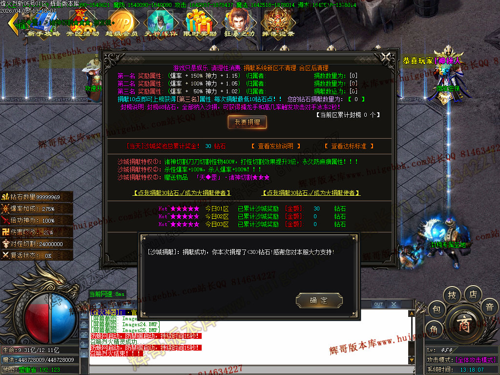 充值32元RMB,30RMB开启沙城捐献 获得刀刀切割怪物500万 怪物爆率增加100%