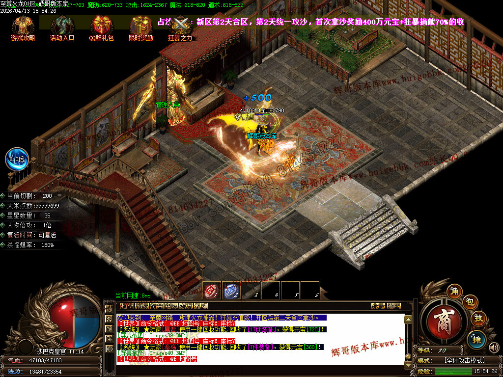 版本介绍:新区第二天,下午14:00合区,晚上八点全体玩家拿沙,奖励丰富