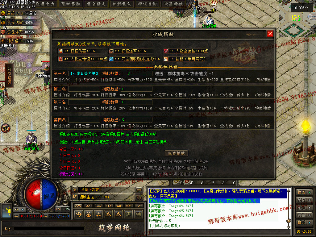 │沙城捐献;30,打怪伤害+30%,打怪爆率+30%,人物全属性+100点 元宝额外回收+20%,赠送半月弯刀技能             │
