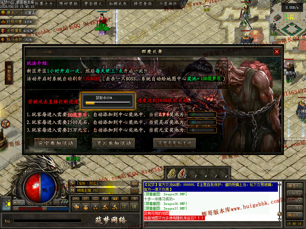 │活动开启时系统自动刷新5只BOSS【击杀一直BOSS,系统自动给地图中心奖池+100筑梦币】                           │